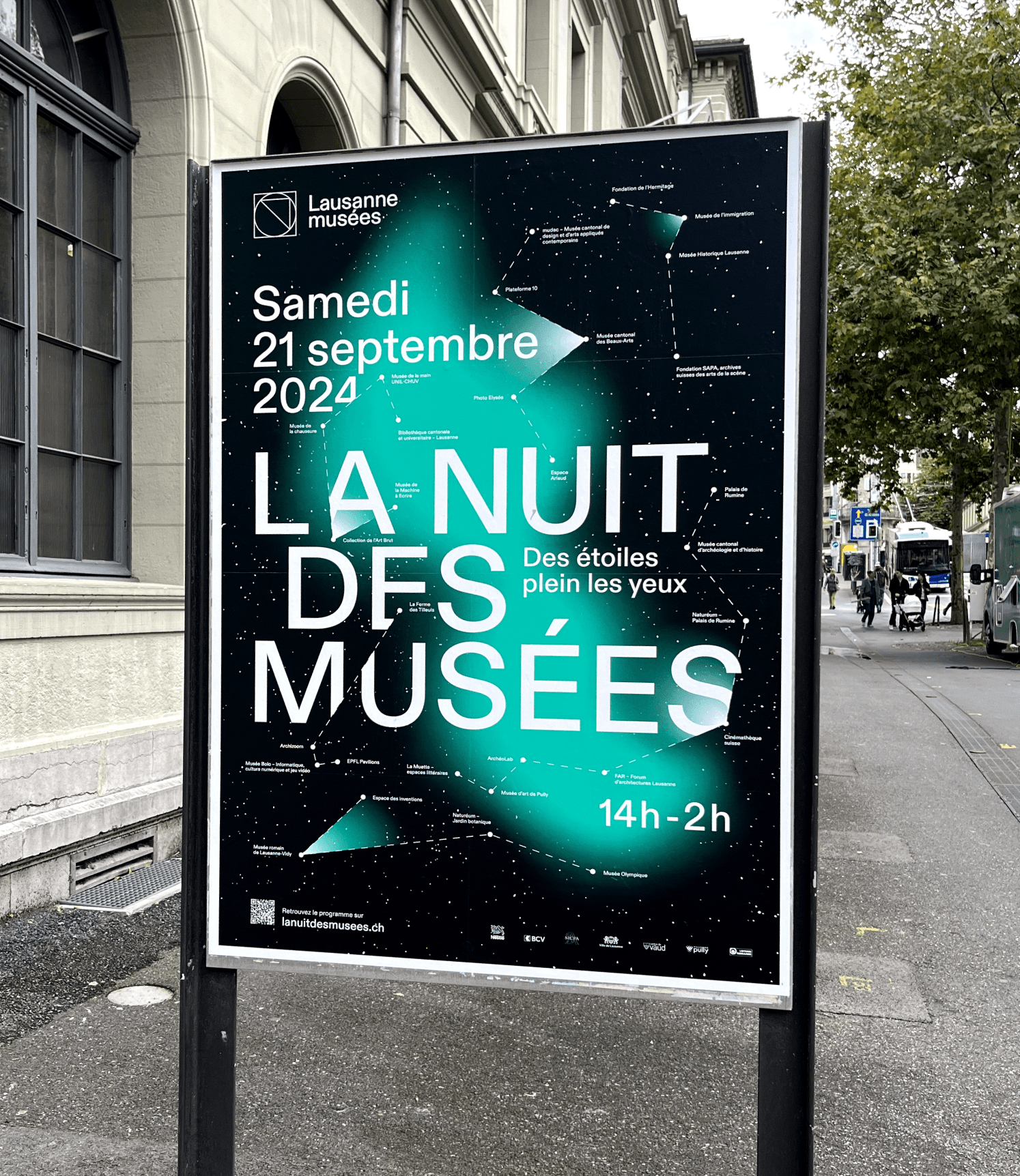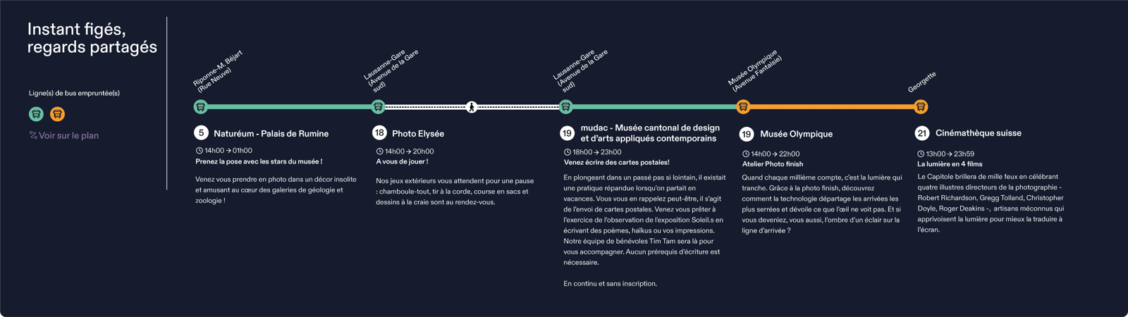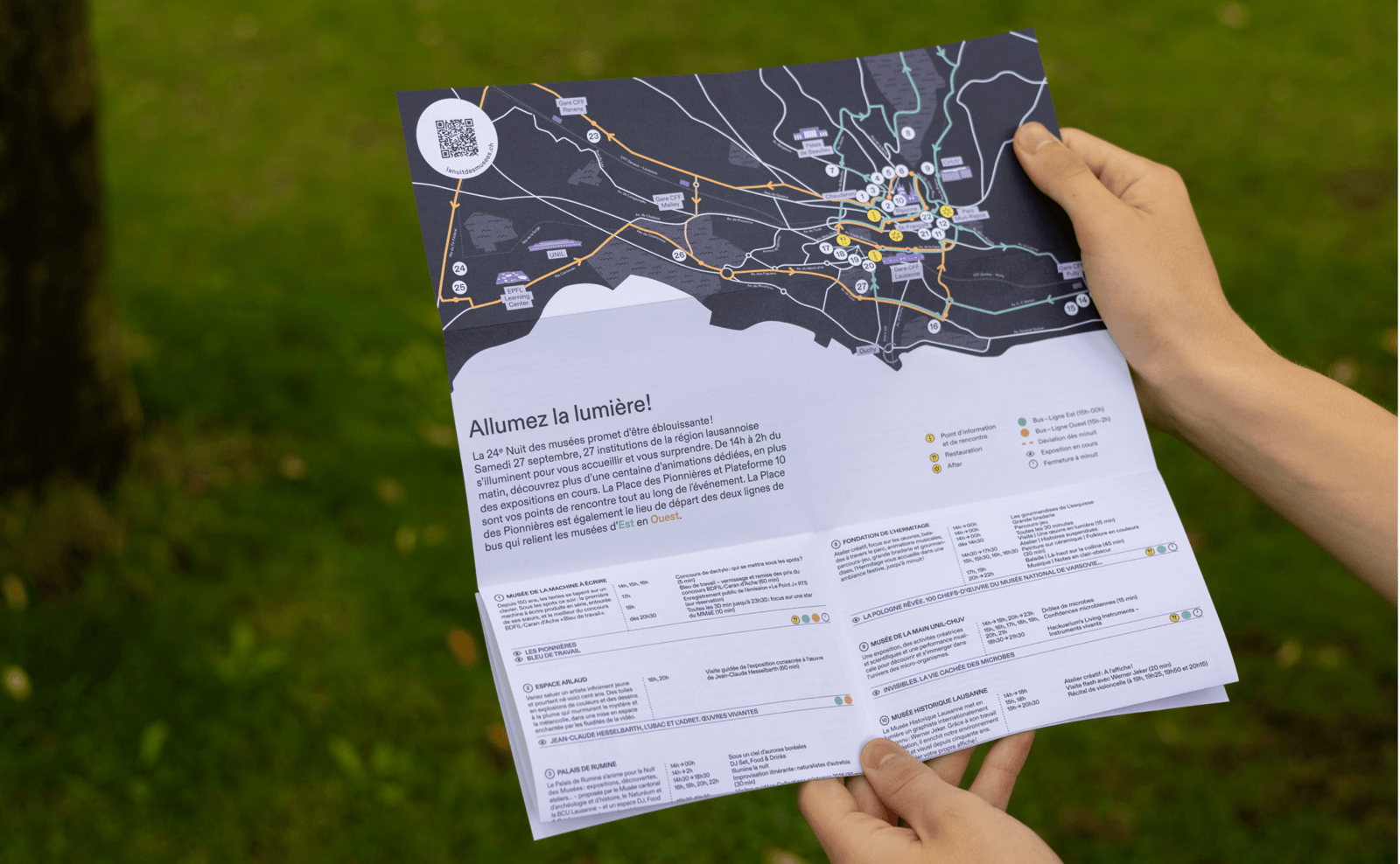 Affiches, programme papier, signalétique, mobilier urbain, newsletters, réseaux sociaux ou encore site internet, le dispositif mis en place s’étend du print au web en passant par un solide ancrage physique. Il inclut également la création de contenus, comme par exemple des parcours thématiques permettant au public de s’orienter parmi plus d’une centaine d’activités.