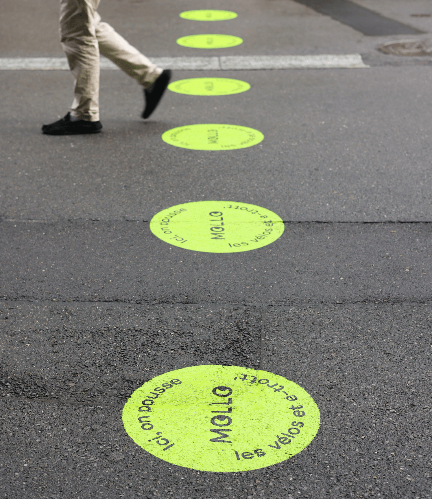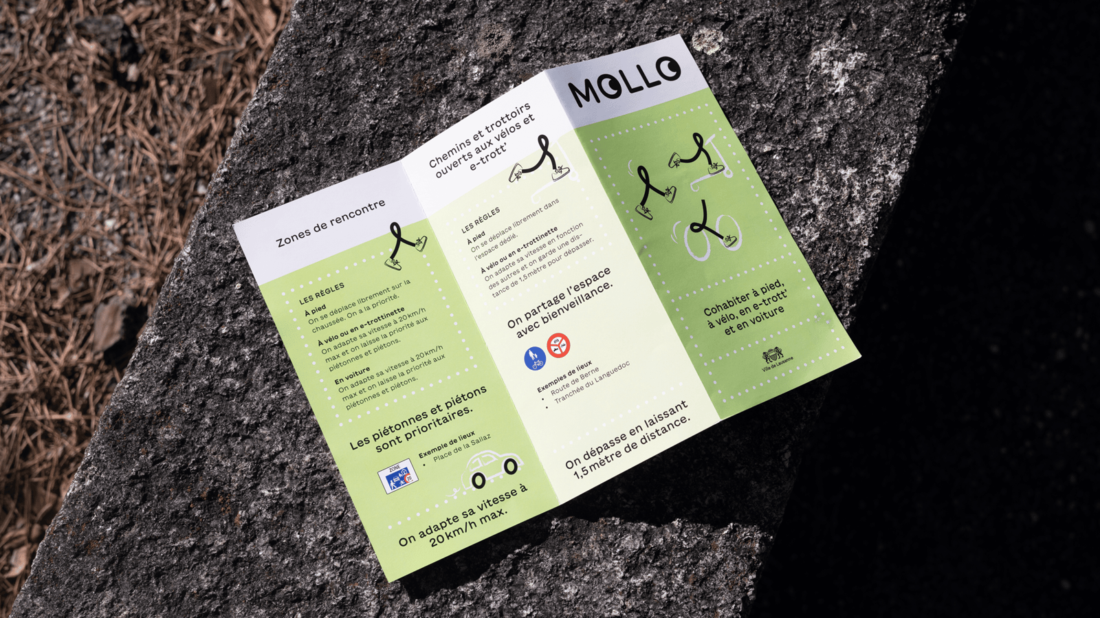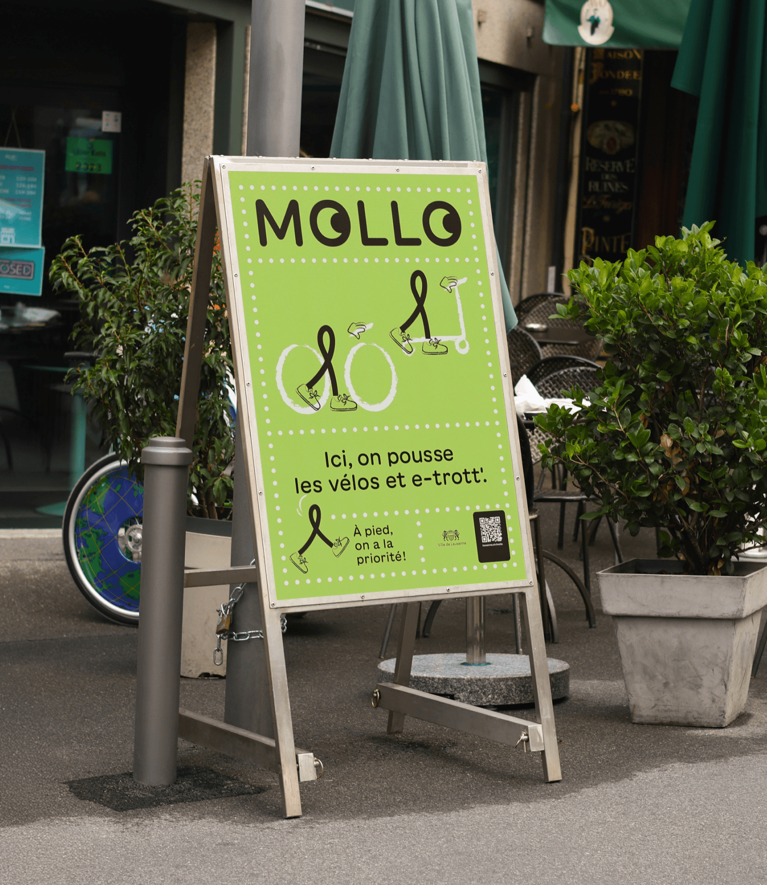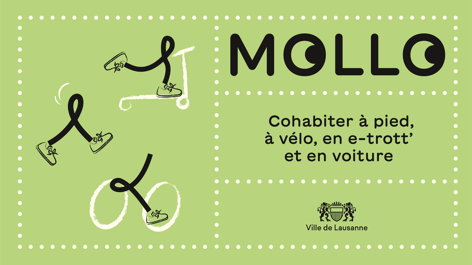 Dans le cadre de la Semaine de la mobilité, la Ville de Lausanne nous a confié la mission de créer une campagne visuelle et événementielle autour d’un enjeu de plus en plus présent dans l’espace public : la cohabitation entre piéton·nes, cyclistes, e-trottinettes et automobilistes. Objectif : donner de la visibilité aux espaces mixtes, rappeler les règles de circulation, améliorer la sécurité de toutes et tous, et surtout rendre ces lieux plus agréables à partager. C’est ainsi que nous avons décliné le concept “Mollo” sous différentes formes.